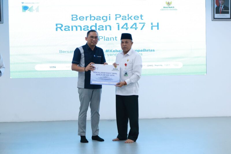 TANGERANG – Badan Amil Zakat Nasional (BAZNAS) Kabupaten Tangerang bersama PT Paragon menyalurkan Zakat Maal, Rabu 11 Maret 2026. Kegiatan ini diasakan di sekitar kawasan PT Paragon Technology and Innovation (Wardah), wilayah Bunderan Cikupa.
