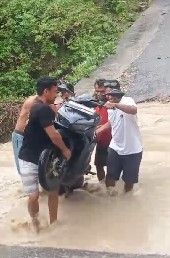 Melalui sambungan telpon Serly Nalle, kepada media ini mengatakan, untung ada keluarga datang membantu menggotong motor ke seberang.